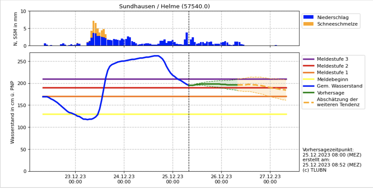 Im Schwerpunktgebiet obere Unstrut, Südharzrand, Helme und Wipper ist über die Nacht Entspannung eingetreten, heißt es im aktuellen Hochwasser-Lagebericht des Freistaates. Hier haben alle Pegel inzwischen die Meldestufe 3 unterschritten, liegen aber häufig immer noch auf hohem Niveau.