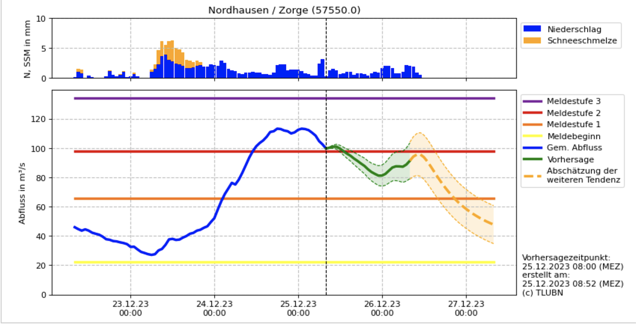 An der Zorge in Nordhausen sollte sich die Lage heute und morgen laut Prognose deutlich entspannen, auch in Ilfeld sollte bald weniger Wasser die Beere hinabfließen.