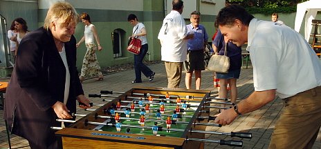 Auf eine ganze Menge Fans könne die Bildungseinrichtung zurückgreifen, so Tölle, mehr als mancher Fußballverein. 2.700 Leute kamen im Laufe dieses Jahres bereits zur Volkshochschule, besuchten 300 Kurse und rund 7.500 Stunden Unterricht. Die Volkshochschul-Mannschaft war heute an ihren weißen Trikots gut zu erkennen. Ein Fußballfeld gab es nur im Kleinen, als Tischfußball. Loni Grünwald wagte ein Spiel gegen Gerhard Tölle und schoß das Siegtor.