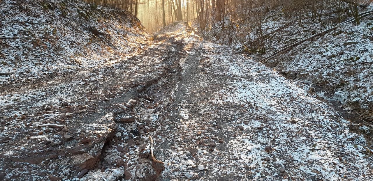 Wir gehen allein für den Südharz von einer Schadenshöhe im Bereich von 300.000 Euro aus, erläutert Volker Gebhardt, ThüringenForst-Vorstand. Die Sanierung der Forstwege kann sodann im Frühjahr erfolgen, wenn der Boden frostfrei und einigermaßen abgetrocknet ist. Forstwege bestehen ausschließlich aus regionalem Naturmaterial ohne chemische Zusatzmittel. Die Tragfähigkeit wird durch die Schichtung unterschiedlicher Korngrößen erreicht, die mit Walzen verdichtet werden. Die oberste Schicht bildet eine feinkörnige Verschleißschicht. Auf Asphaltdecken wird aus ökologischen Gründen im Wald verzichtet.