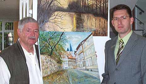 Geschäftsstellenleiter Norbert Schieke mit dem Künstler Wolfgang Spangenberg vor Ausstellung