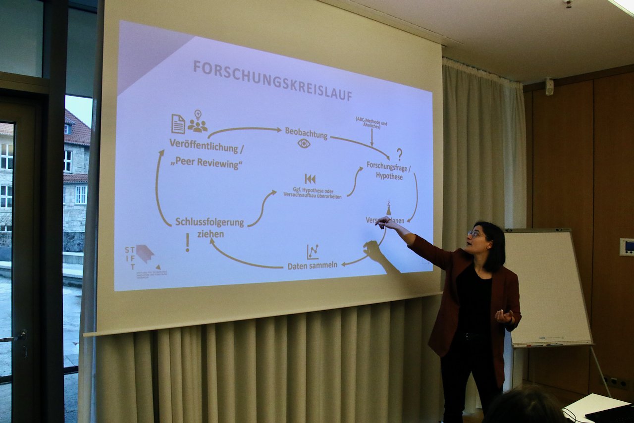 Etwa eine Schulstunde haben beide Seiten Zeit, einander kennen zu lernen. Für manche Gruppen wird das zum Speeddating, andere wüssten schon sehr genau, in welcher Richtung sie mit wem arbeiten wollen, berichtet Gesa Schloen, die die Börse für das Schülerforschungszentrum der Hochschule begleitet. Neben dem Kennenlern-Angebot bietet das Zentrum außerdem zwei Workshops zur allgemeinen Themenfindung und zum wissenschaftlichen Arbeiten.