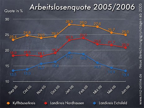 Zum fünften Mal in Folge ist die Arbeitslosigkeit im Juni 2006 deutlich rückläufig. Die Arbeitsagentur hat mit 26.403 fast 1.200 Arbeitslose weniger als im Mai und rund 2.500 als im Vorjahr registriert. Um über 500 ging vor allem im Eichsfeld die Zahl nach unten. Hier sind derzeit noch 7.191 Männer und Frauen auf der Suche nach einer Beschäftigung. 2.700 jugendliche Arbeitslose und damit fast 800 weniger als vor einem Jahr sind derzeit in der Arbeitsagentur gemeldet. Die Agentur für Arbeit verstärkte im vergangenen Monat ihre Aktivitäten mit Unterstützung einiger Maßnahmeträger. Für 38 Jugendliche begannen Trainingsmaßnahmen, die bereits nach kurzer Zeit für 50 Prozent der jungen Leute einen Arbeitsvertrag nach sich zogen.