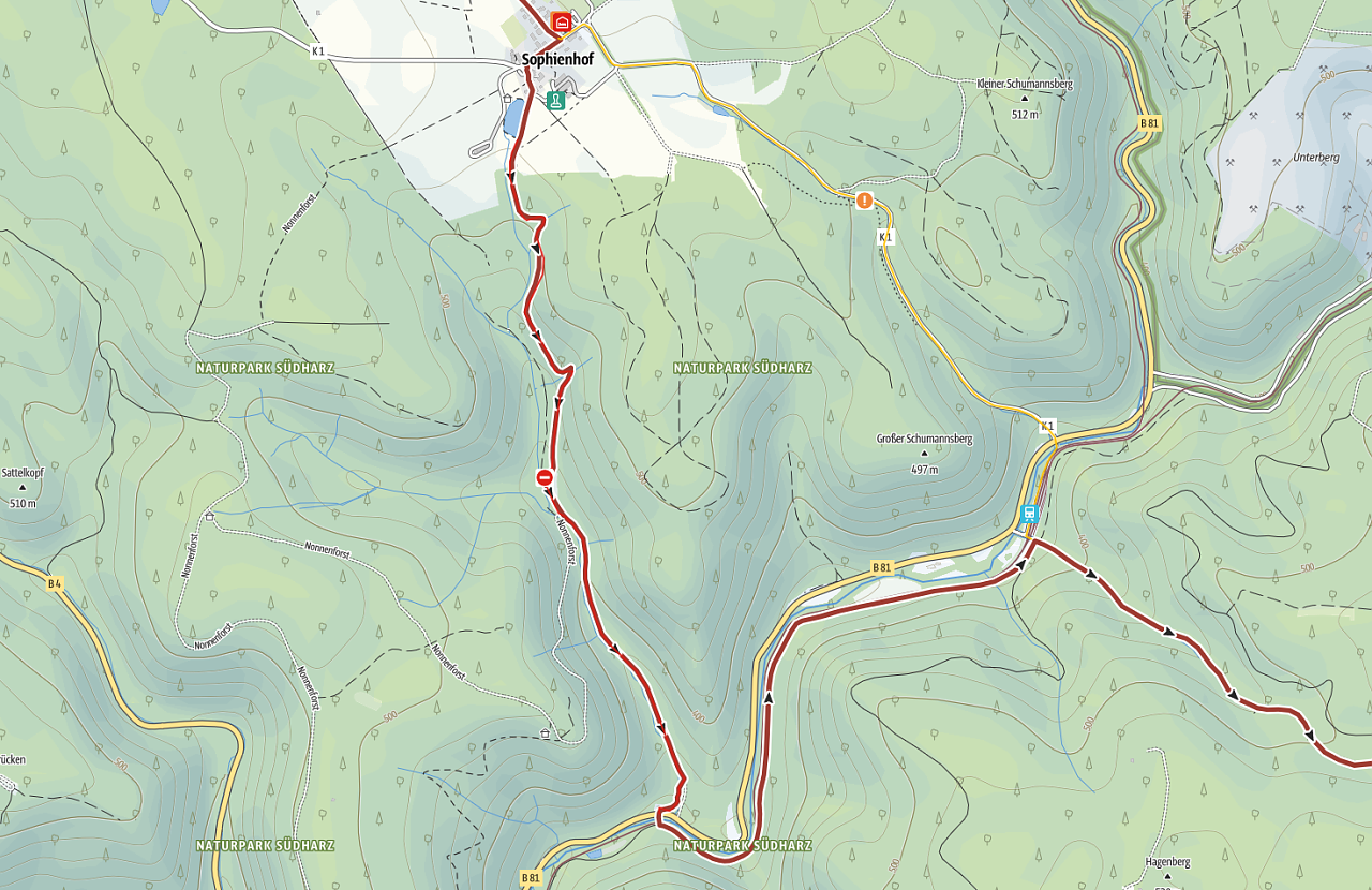 Das Forstamt führt derzeit Maßnahmen zwischen der B81, im Bereich der Berebrücke bis zum Eingang in die Lindenhöhle, welche hinauf nach Sophienhof führt, durch. Sowohl der Südharzer Dampflok Steig als auch alle weiteren Wanderwege sind dadurch mehrere Wochen nicht begehbar...