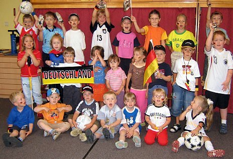Das Fußballfieber hat auch die Kinder im Kindergarten "Sonnenhof" in Ellrich des Jugendsozialwerk Nordhausen e. V. angesteckt. Mit Riesenpower ging es auf die Wiese zum Turnier und wie bei den ganz großen Kickern gab es die gelbe und rote Karte. Die Sieger erhielten einen Pokal und laut war der Schlachtruf zu hören: "Berlin, Berlin...".