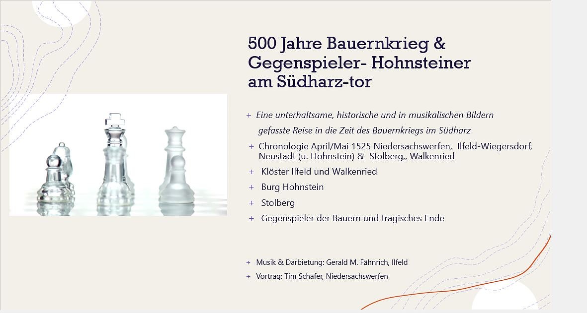 Eine Vision für ein Leben, welches nicht erst durch Erlösung im Himmel lebenswerter wird, gebar erste Anzeichen von Demokratie, Rechten und Freiheit auch für den kleinen Mann. Wie sich zeigt, waren die Aufständischen aus unseren Ortschaften bereit, sich mit adligen Herren zu verbinden, suchten deren Unterstützung. Nahmen es also nicht wörtlich mit Müntzer, gaben sich teils aber im Rausch der Tat dem Regenbogen Müntzers hin. Dagegen zog man nach Ilfeld, plünderte das Kloster, die Kirche und weiter nach Neustadt zur Burg Hohnstein, um dort den Ilfelder Klosterschatz zu erpressen. Was noch in Neustadt damals geschah, lassen Sie sich überraschen. Daher wird im Frühherbst auf Burg Hohnstein auch die Premiere zur Abendveranstaltung stattfinden. Für einige Bauern aus unserer Heimat endete der Aufstand tragisch, wurden diese doch zur Abschreckung hingerichtet. Nicht zuletzt wird die Rolle der Prominenten Hohnsteiner Gegenspieler im damaligen heiligen römischen Bereich beleuchtet, sozusagen, was die dunkle Seite der Macht antrieb. Über Walkenried und Stolberg lassen sich weitere Stationen, quasi tagesgenau für die Heimatforschung abbilden. Einige Anekdoten sind von den Chronisten überliefert. Die Veranstaltung bietet auch einige zeittypische derbe Witze, Bilder, Filmausschnitte.