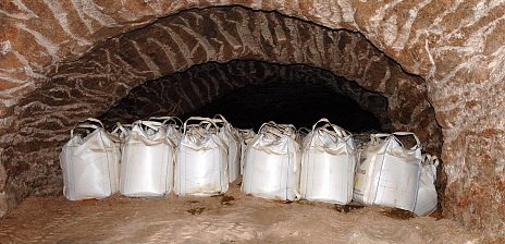 Der Big Bag Versatz, der auch für Sollstedt im Gespräch ist, ist personalintensiver. Die Versatzmaterialien werden als Schüttgut, Siloware oder schon fertig verpackt angeliefert. Nicht verpackte Abfälle werden konditioniert, das heißt mit Bindemitteln und Lauge gemischt und verpackt. Die Materialien reagieren miteinander und es entsteht ein fester Betonklumpen. Im Förderkorb geht’s in die Tiefe. Gabelstapler holen die Beutel heraus und setzen sie auf Radlader. In Sollstedt sollen dafür untertagetaugliche Schwerlasttransporter verwendet werden. Die können dann auch mehr als nur sechs Big Bags transportieren. Die Säcke werden schichtweise in die durchschnittlich zwölf Meter hohen Abbauhallen gesetzt. Über jede Lage wird eine Lage feines Kalisalz verfüllt. Angefeuchtet mit Lauge reagiert das Salz zu einer steinharten Masse. Auf diese Schicht kann dann die nächste Lage Big Bags mit Radlagern aufgebracht werden bis der Leerraum fast verfüllt ist. Die oberste Lage besteht dann wieder aus Kalisalz. Im Lauf der Zeit übernimmt der Berg den Rest und schließt die Versatzstoffe vollständig ein. Sie werden sozusagen ein Teil des Gebirges und geben ihm damit seine Stabilität wieder. Der Bergmann nennt den Vorgang Konvergenz, das Aufeinander zu bewegen Gesteinen. Dieser komplette Einschluß der Versatzstoffe macht die Kalibergwerke so attraktiv für die Einlagerung von Schlacken, Filterstäuben und ähnlichem.