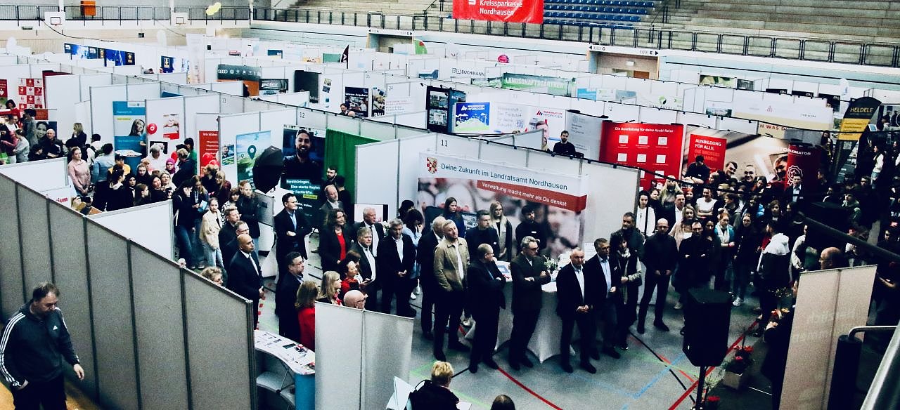 Die Region braucht mehr. Mehr Handwerker, mehr Ingenieure, mehr Pflegekräfte, mehr Therapeuten, mehr Polizisten, Justiz- und Zollbeamte, ja selbst mehr Bergarbeiter werden wieder händeringend gesucht. Entsprechend voll ist es auch zur Eröffnung, 78 Aussteller sind es heute, noch einmal deutlich mehr, als im letzten Jahr, freut sich Sparkassenchef Thomas Seeber, der die Begrüßung zusammen mit Landrat Matthias Jendricke übernahm. Rund 150 Berufsbilder werden vorgestellt, außerdem haben sich drei Hochschulen eingefunden, darunter natürlich auch der Nordhäuser Campus, der alleine 30 Studienrichtungen bietet.