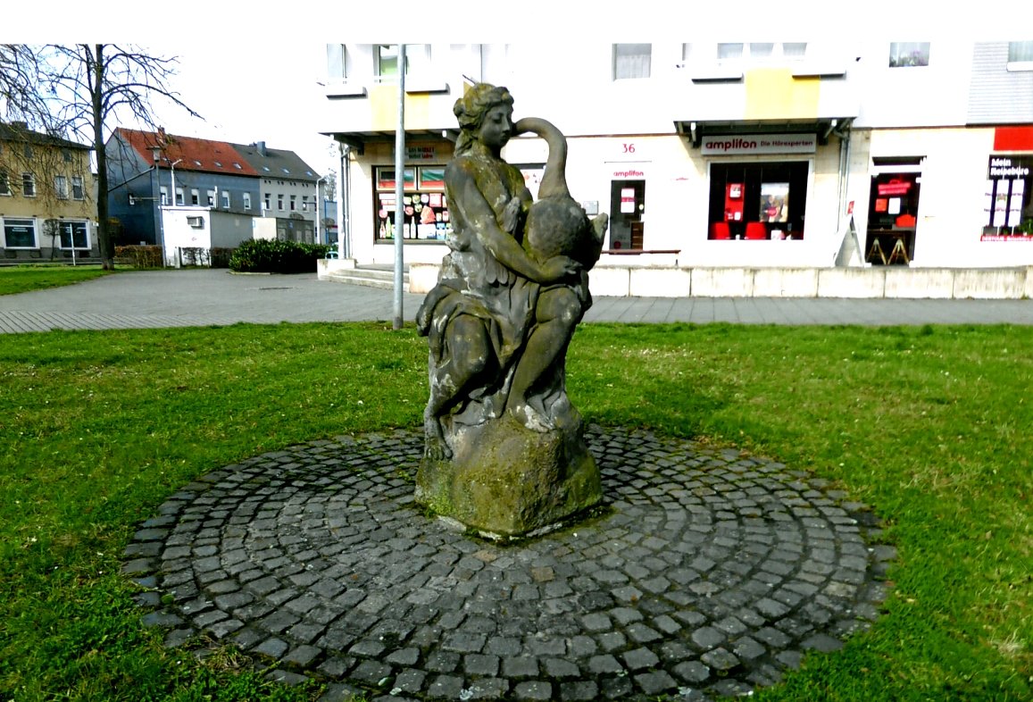 Genau weiß man nicht, wie dieser Teil der Plastik angebracht worden war, dessen Hals, so hat es jetzt den Anschein, nicht mehr den Verlauf der ursprünglichen Haltung besitzt. Aber es war klar, dass die Figurengruppe nicht mehr Teil einer Wasserkunst sein würde. So pflasterte man symbolisch darum einen Steinring. Die Initiative zur Restaurierung ging von den Rotariern aus, die auch die Geldmittel beisteuerten. Eine Tafel, etwas entfernt am Bürgersteig angebracht, gibt Auskunft. Wenige kleinere Steinplatten zum Denkmal hin in die Grasfläche eingefegt, würden anregen, zum Denkmal zu gehen, denn solche Kunstwerke muss man umschreiten.