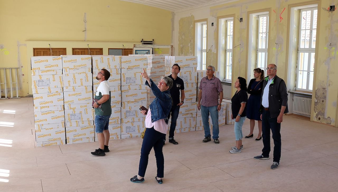 Das unter Denkmalschutz stehende Schulgebäude sowie die Turnhalle aus dem Jahr 1953 wurden im Inneren komplett entkernt, dabei wurden u.a. Klassenzimmer teilweise zusammengelegt und damit deutlich vergrößert, das Mauerwerk musste teilweise trockengelegt werden, die Küche und der Speiseraum wurden komplett umgebaut und ebenfalls vergrößert. Für mehr Energieeffizienz wurden eine elektrisch betriebene Luft-Wasser-Wärmepumpe in Verbindung mit einem Gasbrennwertkessel zur Spitzenlastabdeckung sowie eine Photovoltaikanlage eingebaut. Das Gebäude verfügt nun außerdem über eine moderne Lüftungsanlage im Speiseraum sowie in den Unterrichtsräumen und ist barrierefrei auch für Rollstuhlfahrer erreichbar. Eine besondere Herausforderung bei den Arbeiten ist der Denkmalschutz, der viele Vorgaben mit sich bringt, erläuterte Iris Follak, die diese Maßnahme im Landratsamt betreut, bei der Besichtigung. Zudem sei während der Arbeiten teilweise eine deutlich schlechtere Bausubstanz als erwartet festgestellt worden, was einer der Gründe für die Kostensteigerungen ist. Derzeit rechnet die Landkreisverwaltung mit einer Gesamtinvestition von gut 8 Millionen Euro für die Sanierung des Schulgebäudes und der angebauten Turnhalle sowie für die Fertigstellung des Außengeländes mit einer erneuerten Ver- und Entsorgung.