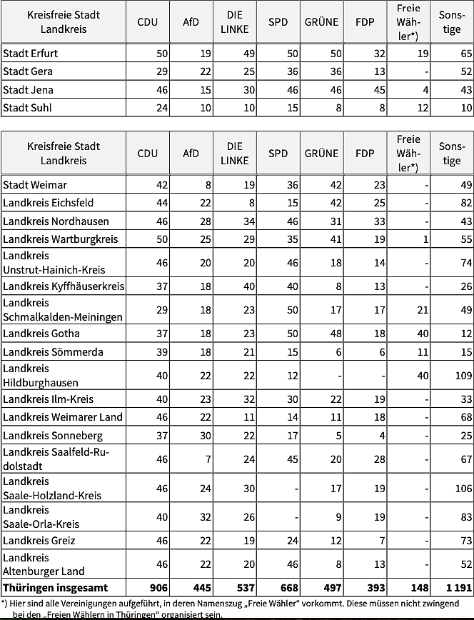 In Thüringen sind insgesamt 980 Sitze für die Kreistage und die Stadträte in den kreisfreien Städ-ten zu vergeben. Für die am 26. Mai 2024 zu vergebenden Sitze wurden von den Wahlausschüssen insgesamt 192 Wahlvorschläge mit 4 725 Bewerberinnen und Bewerbern zur Wahl zugelassen. Von den 4 725 Bewerbern sind 1 322 weiblich; dies entspricht einem Anteil von 28,0 Prozent. Zur Kreistags-/Stadtratswahl ergibt sich für die Parteien das nachfolgende Bewerberbild: