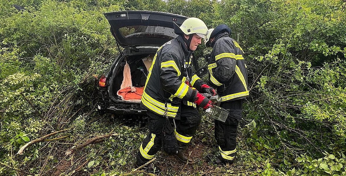 Hier kam der Mann mit seinem Fahrzeug auf Grund von Aquaplaning ins Schleudern und katapultierte über die Schutzplanke in der Autobahnabfahrt. Die Fahrt endete knapp 50 Meter später in einem Gebüsch.
