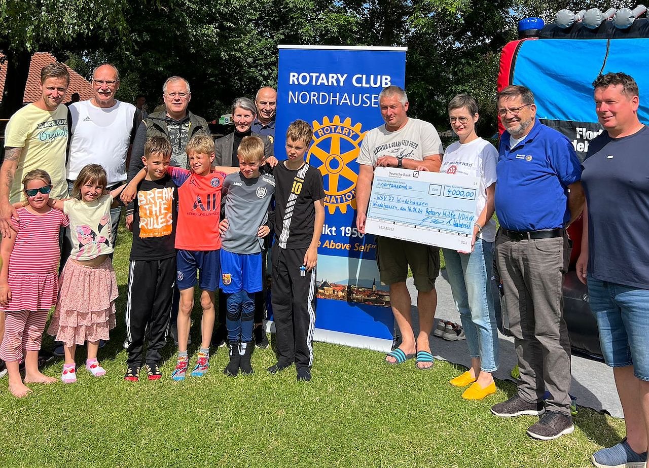 Dieses beeindruckende Signal der Sportler um Vereinsvorsitzenden Enrico Hoffmann wurde bei Rotary bis an die Ostseeküste vernommen und so entschlossen sich die Rotary Clubs Rostock, Rostock Horizonte und Warnemünde gemeinsam mit dem Rotary Club Nordhausen spontan zur Hilfe. Jeder Club spendete 1.000 EUR und so konnte rechtzeitig vor dem anstehenden Beginn der Sanierungsarbeiten am vergangenen Wochenende, anlässlich des Vereinssportfestes, ein Scheck über 4.000 EUR an den WSV 77 übergeben werden.