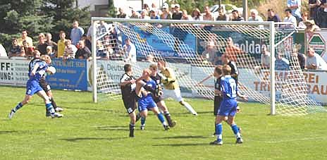 Die Stimmung war recht aufgeheizt. Die wilden Horden aus Nordhausen hatten bereits eine halbe Stunde vor Spielbeginn ihre Stellung hinterm Zaun auf dem Göldner bezogen. Sie sahen nach dem Anpfiff eine munter aufspielende Wacker-Truppe, die in den ersten zehn Minuten reihenweise Chancen (Braun/4., Klaus/5.) hatte, diese aber nicht verwerten konnte. Lars Pohl sorgte in der 13. Minute per Kopf noch einmal für Gefahr vor dem Sonderhäuser Tor. Dann verflachte die Begegnung, die Nordhäuser ließen sich von spieltechnisch schwachen Sondershäusern einlullen.