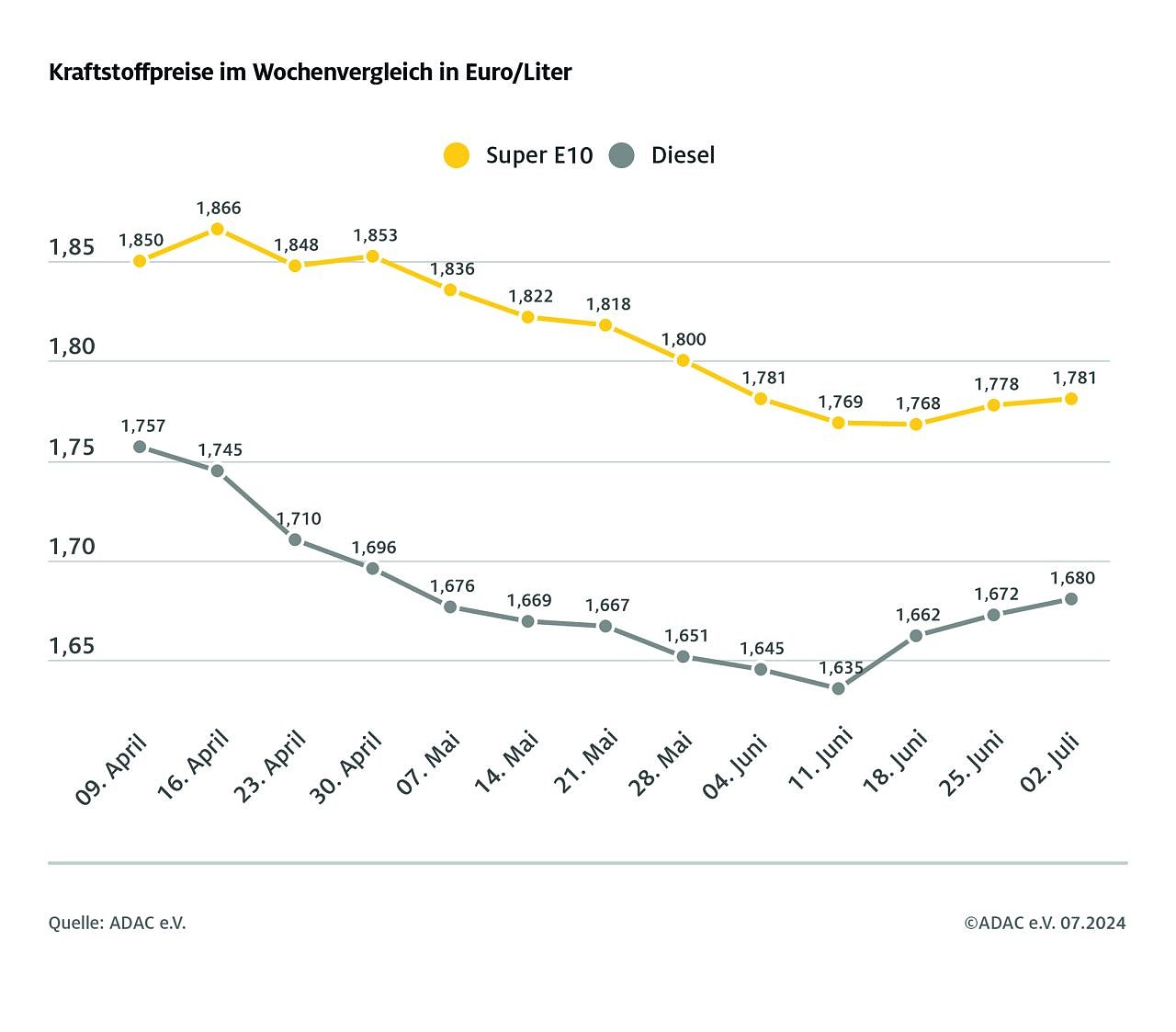 Nach Einschätzung des ADAC befindet sich der Benzinpreis damit wie schon vor Wochenfrist auf einem angemessenen Niveau. Bei Diesel gibt es jedoch weiterhin Potenzial für deutliche Preissenkungen, da die Steuer je Liter um rund 20 Cent niedriger ausfällt als bei Benzin, der tatsächliche Preisunterschied aktuell jedoch nur gut zehn Cent beträgt.