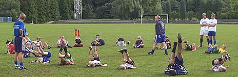 Am heutigen Vormittag dann der sportliche Höhepunkt, das Abschlußtraining mit den Großen. Die nnz war beim Aufwärmtraining dabei. Zwischen den Nachwuchs mischten sich Sven Pistorius, Daniel Braun, Tino Steinberg und Stephan Hoffmann von der Ersten. Die fachmännische Anleitung übernahm kein geringerer als Cheftrainer Uwe Etzrodt.