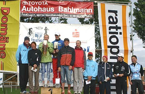 Auch in der Damen-Konkurrenz gab es an der Spitze neue Namen. Dabei machte sich die Gesamtsiegerin Katja Dörre vom Tri-Finish Münster gleichzeitig ihr schönstes Geburtstagsgeschenk. Mit der Zeit 01:08:53 h hatte sie die Konkurrenz jederzeit im Griff, welche mit Judith Lotz (HSV Weimar, 01:12:14 h) und Susann Kramer (SV Halle, 01:12:30 h) auf den Plätzen folgte. Einen heißes Duell lieferten sich die Nordhäuserin Ann-Kathrin Sourell (SVN ’90) und Franziska Wittig (HSV Weimar) um die Plätze 4 und 5, das Wittig am Ende zwar äußerst knapp für sich entschied, auf der Ziellinie jedoch völlig entkräftet zusammenbrach (Wittig 01:12:36 h, Sourell 01:12:46 h). Ann-Kathrin Sourell hat mit ihrem 5. Platz im Damengesamtklassement von 29 Teilnehmerinnen ihre gute Saison mit einem Klasse-Ergebnis gekrönt.