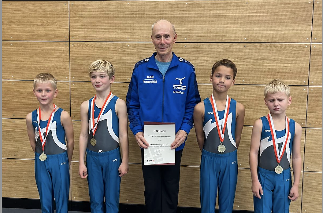 Autor: redAls Mannschaft mussten sich Theo (9), Max (9), Louis (8) und Levien (7) in der AK 8/9 beweisen, um sich mit den Besten aus Thüringen zu messen. Und sie waren ein eingeschworenes Team, konzentriert gingen die 4 Jungs an die Geräte. Sie konnten nicht nur ihr Leistungsniveau abrufen, sondern erzielten an allen Geräten die meisten Punkte und siegten souverän mit 10 Punkten Vorsprung.