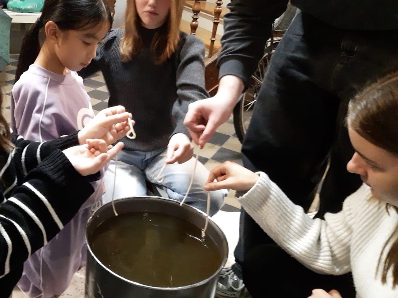 Zum Trocknen der Schicht muss jedes Kind mit seiner Kerze eine kleine Runde laufen, bevor der Tauchgang wiederholt werden kann. So entsteht nach und nach die Kerze, die zum Schluss auch noch für eine schöne Optik eingedreht werden kann. Jedes Kind darf seine fertige Kerze zum Abbrennen mit nach Hause nehmen.