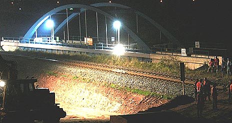 Die Ortsumfahrung von Sondershausen nimmt mehr und mehr Gestalt an. "Gott sei Dank!" werden viele sagen, die regelmäßig die B 4 nach Erfurt fahren müssen. Zur Zeit sind kilometerlange Staus angesagt. Gebaut wird an allen Ecken. Gestern wurde mit dem Einbau einer neuen Bahnbrücke im Stadtteil Stockhausen begonnen. Noch steht das Bauwerk neben den Gleisen. Die wurden heute Nacht abgebaut. Nun heißt es das Schotterbett abtragen und den Hang weg baggern. Dann erst kann die Brücke an ihren eigentlichen Platz geschoben werden.