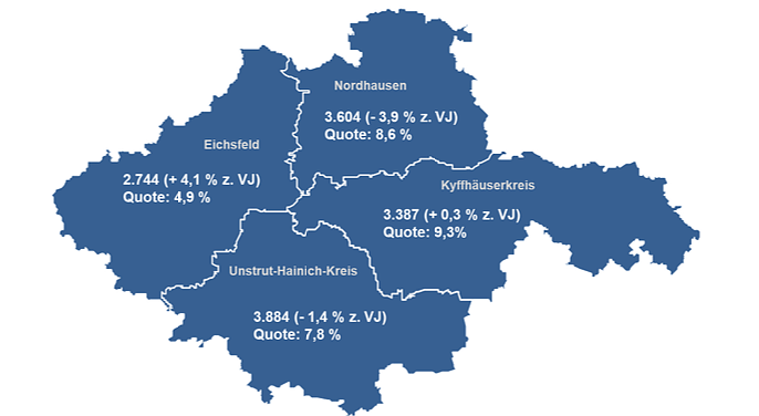 Im Kyffhäuserkreis ist die Arbeitslosigkeit im Januar 2025 auf 3.387 Menschen ge- stiegen. Das waren 211 Personen mehr (+ 7 Prozent) als im Dezember und 10 Per- sonen mehr (+ 0,3 Prozent) als vor einem Jahr. Die Arbeitslosenquote betrug 9,3 Prozent und lag mit 1 Prozent über dem Vormonatsniveau. Vor einem Jahr lag sie bei 9,4 Prozent. Die Beschäftigung sank um 334 Frauen und Männer (- 1,7 Prozent) zum Vorjahresmonat auf 18.765 Beschäftigte im Juli 2024.