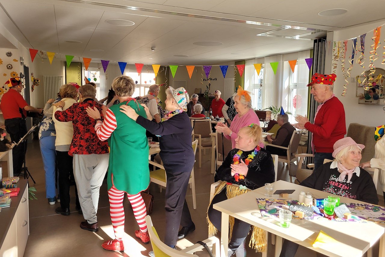 Mit Pauken und Trompeten, roten Nasen bunten Hüten kamen die Senioren am Rosenmontag zur Faschingsfeier in die Tagesbetreuung. Mit einem Narrenruf wurden alle Narren und Jecken von den Mitarbeitern begrüßt.