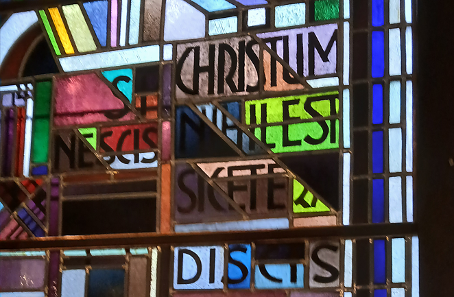 Autor: redVon kunsthistorischem Wert europäischen Ranges sind die monumental und zugleich filigran wirkende Glasbilder. Es können drei Glasbildfenster mit sakralen Motiven des niederländischen Künstlers Johan Thorn-Prikker (1868 bis 1932) in der ehem. Klosterschule hier bestaunt werden. Thorn-Prikker ist als niederländischer Maler erst spät zur Glaskunst gekommen und gilt als einer der bedeutendsten Glaskünstler Europas des letzten Jahrhunderts. Seine Fenster sind gestaltet im Stil des modernen Expressionismus der 1920er Jahre. Das Werk rechts widmet sich der Ewigen Lampe von Ilfeld, als erstes sakrales Artefakt, welches sagenhaft mit einer längst vergangenen Zeit vor über 900 Jahren überliefert wird. Linkes Fenster: Links ist ein Querschnitt durch das alte Kloster Ilfeld der Heiligen Maria mit seinen Kreuzgängen dargestellt. Die Bücherrücken symbolisieren die Gelehrtenschule. Die Inschrift lautet, vgl. beigefügtes Detailbild: Si Christum nescis, nihil est, si cetera discis." Deutsch: Wenn Du Christus nicht verstehst, gibt es nichts, was Du sonst erkennen kannst. (empfunden nach Epheser 3, 19).