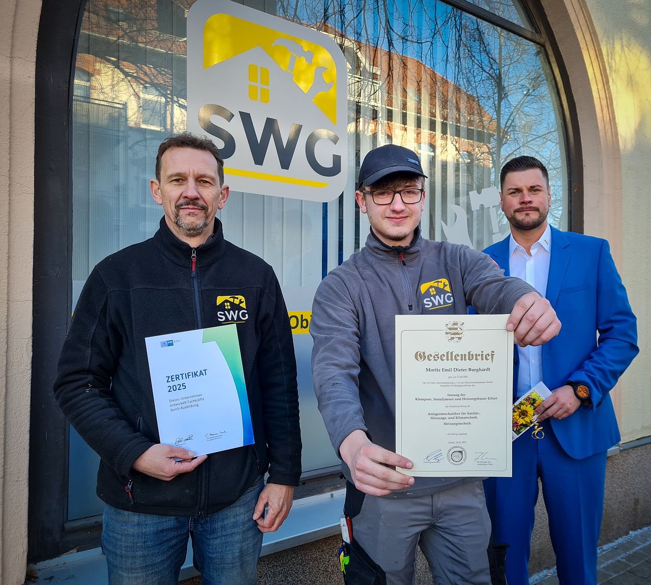 Moritz Burghardt hält seinen Gesellenbrief in der Hand: Nach dreieinhalb Jahren hat der 22-jährige Bleicheröder seine Ausbildung zum Anlagenmechaniker für Sanitär-, Heizungs- und Klimatechnik erfolgreich abgeschlossen und ist damit der erste fertige Auszubildende der SWG Objektmanagement...