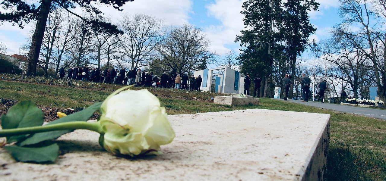 Der ist in Thüringen im übrigen die größte Anlage seiner Art. Von der Neugestaltung geht eine gewissen Kühle aus, die aber durchaus gewollt ist, erklärt Oberbürgermeister Kai Buchmann Eingangs, der Friedhof soll kein leichter Ort sein. Wobei die neue Form des Friedhofs noch nicht voll zu sehen ist, bisher ist es nur ein paar Frühblühern gelungen, das Erdreich zu durchstoßen. Ergänzt wurden diese heute um weiße Rosen und im Falle Ernest Gaillard auch um einen Blumenkranz.