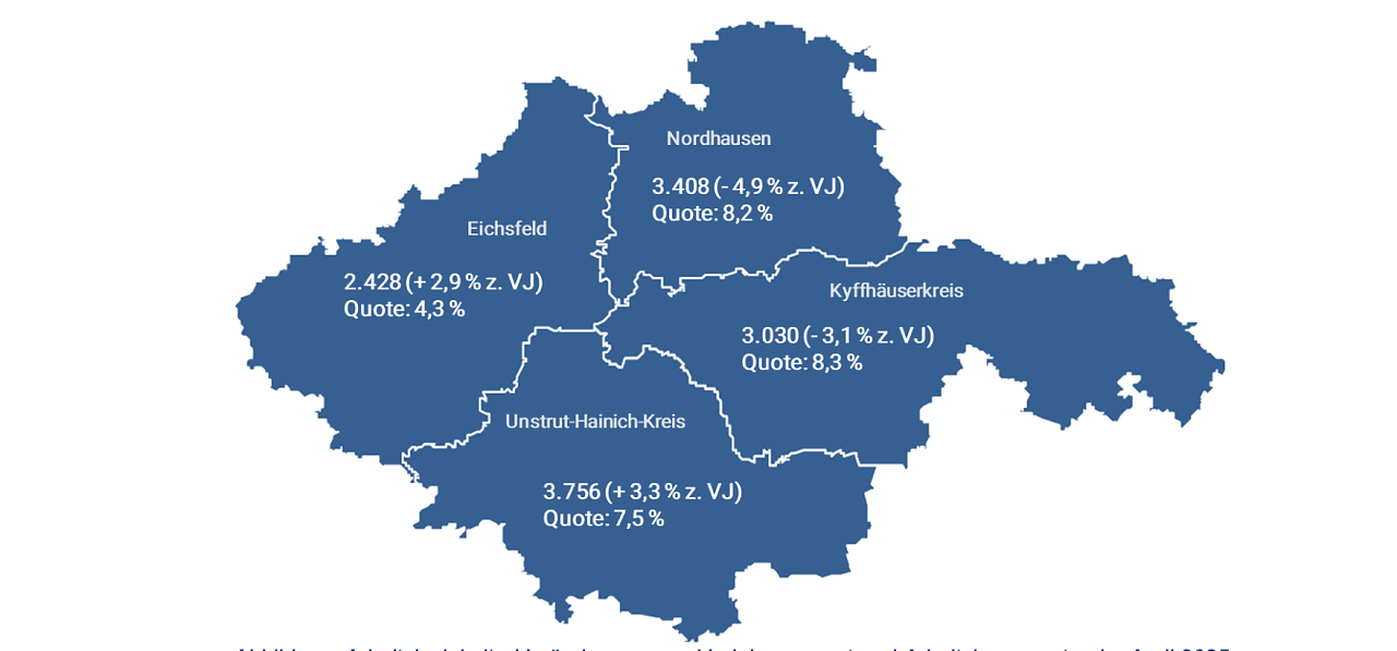 Der stärkste Rückgang der Arbeitslosigkeit zum Vorjahr war im Landkreis Nordhausen. Dort konnte die Zahl der Arbeitslosen zum Vorjahresmonat um 4,9 Prozent gesenkt werden. Auch im Kyffhäuserkreis lag die Arbeitslosigkeit im März 3,1 Prozent niedriger als im Vorjahresmonat. Im Unstrut-Hainich-Kreis ist sie um 3,3 Prozent gestiegen. Das Eichsfeld verzeichnet einen Anstieg der Arbeitslosigkeit zum Vorjahr um 2,9 Prozent. Der Landkreis bleibt dennoch der mit der niedrigsten Arbeitslosenquote im Agenturbezirk. Im April 2025 betrug sie 4,3 Prozent. Von den insgesamt 12.622 arbeitslos Gemeldeten hatten im April 5.047 Frauen und Männer keinen Berufsabschluss (40,0 Prozent).