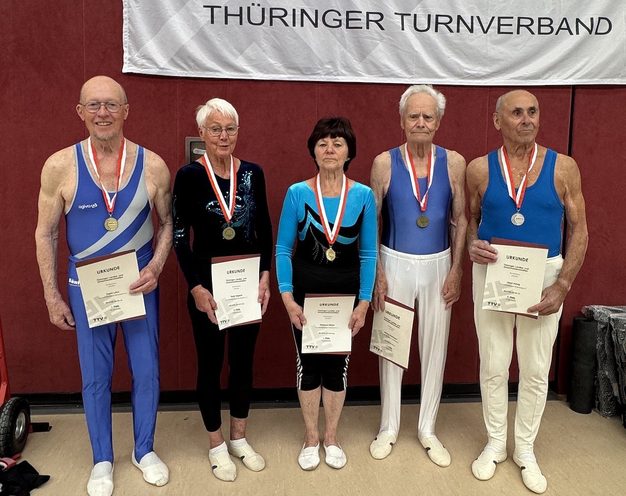 Auch die Oldies turnten einen Tag später ihren Meister aus. Dabei ging es auch um die Qualifikation für die Deutschen Seniorenmeisterschaften am 29. Mai im Rahmen des Deutschen Turnfestes in Leipzig. Dabei erturnten die fünf Nordhäuser Starter einen kompletten Medaillensatz: