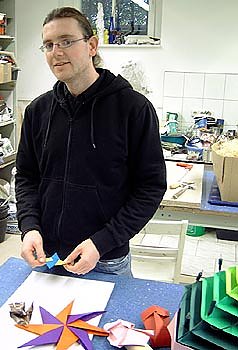 Am Samstag (2. 12.), zwischen 10.00 Uhr und 15.00 Uhr führt der Künstler Henry Kraft in die uralte Kunst des Papierfaltens ein. Jeder Interessent wird befähigt, Papiermodelle eigenständig zu falten. Dazu gibt es Anleitungskopien, um die gefalteten Modelle auch zu Hause nachfalten zu können.
