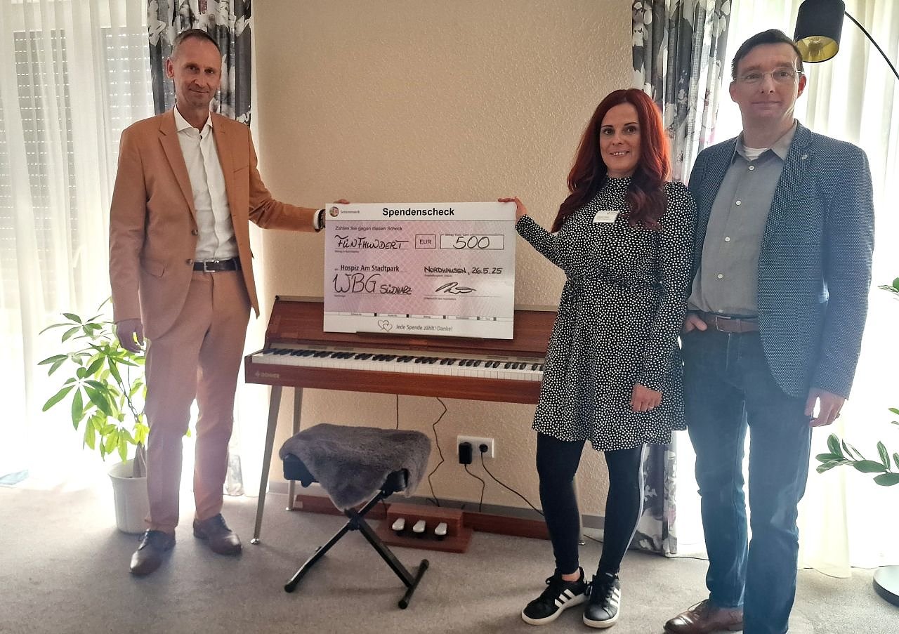 Das Seniorenwerk ist in der Otto-Ludwig-Straße in Nordhausen mit seinem Ambulanten Hospiz- und Palliativdienst selbst auch Mieter bei der WBG Südharz und freut sich über die finanzielle Unterstützung. Sven Dörmann verwies bei der Scheckübergabe auf die Verantwortung gerade für die älteren Mitglieder der Wohnungsbaugenossenschaft. Diese sollen sich auch während ihres letzten Lebensabschnitts umsorgt fühlen. Christin Delert und Seniorenwerk-Geschäftsführer Christian Döring konnten bei dem Treffen berichten, dass die täglichen Musikstunden auf dem E-Piano sehr zur Freude der Gäste beitragen.