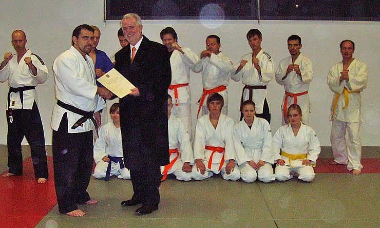 Autor: nnzDie Kampfsportschule Nordhausen freut sich über Trainingsanzüge, die vom Thüringer Minister für Wirtschaft, Technologie und Arbeit Jürgen Reinholz (rechts im Bild bei der Übergabe des Schecks an den Vorsitzenden Thomas Köhler) aus Lottomitteln des Freistaates Thüringen zur Verfügung gestellt wurden. Dafür möchte sich das Team KSS NDH e.V. ganz herzlich bedanken. Ab dem 8. Januar 2007 finden wieder Neuaufnahmen im Ju-Jutsu/ Jiu-Jitsu und Sanda statt, Probetraining immer Montag und Donnerstag ab 19.30 bis 21.00 Uhr in der Wiedigsburghalle.