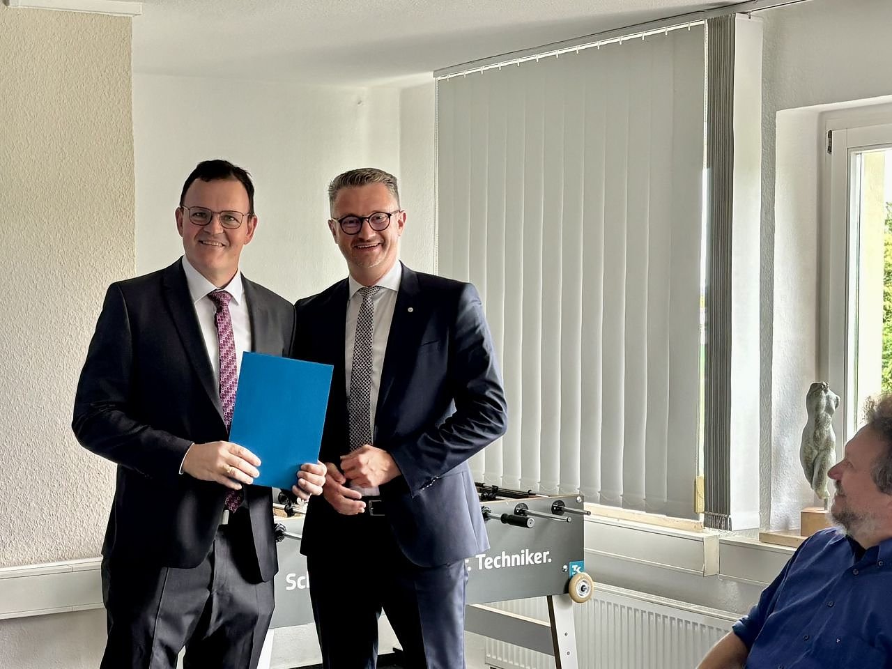 Zu Beginn des Besuchs überreichte Minister Tischner auch im Namen von Ministerpräsident Mario Voigt eine Urkunde an Präsident Wagner und gratulierte ihm herzlich zum 25-jährigen Dienstjubiläum im öffentlichen Dienst.
