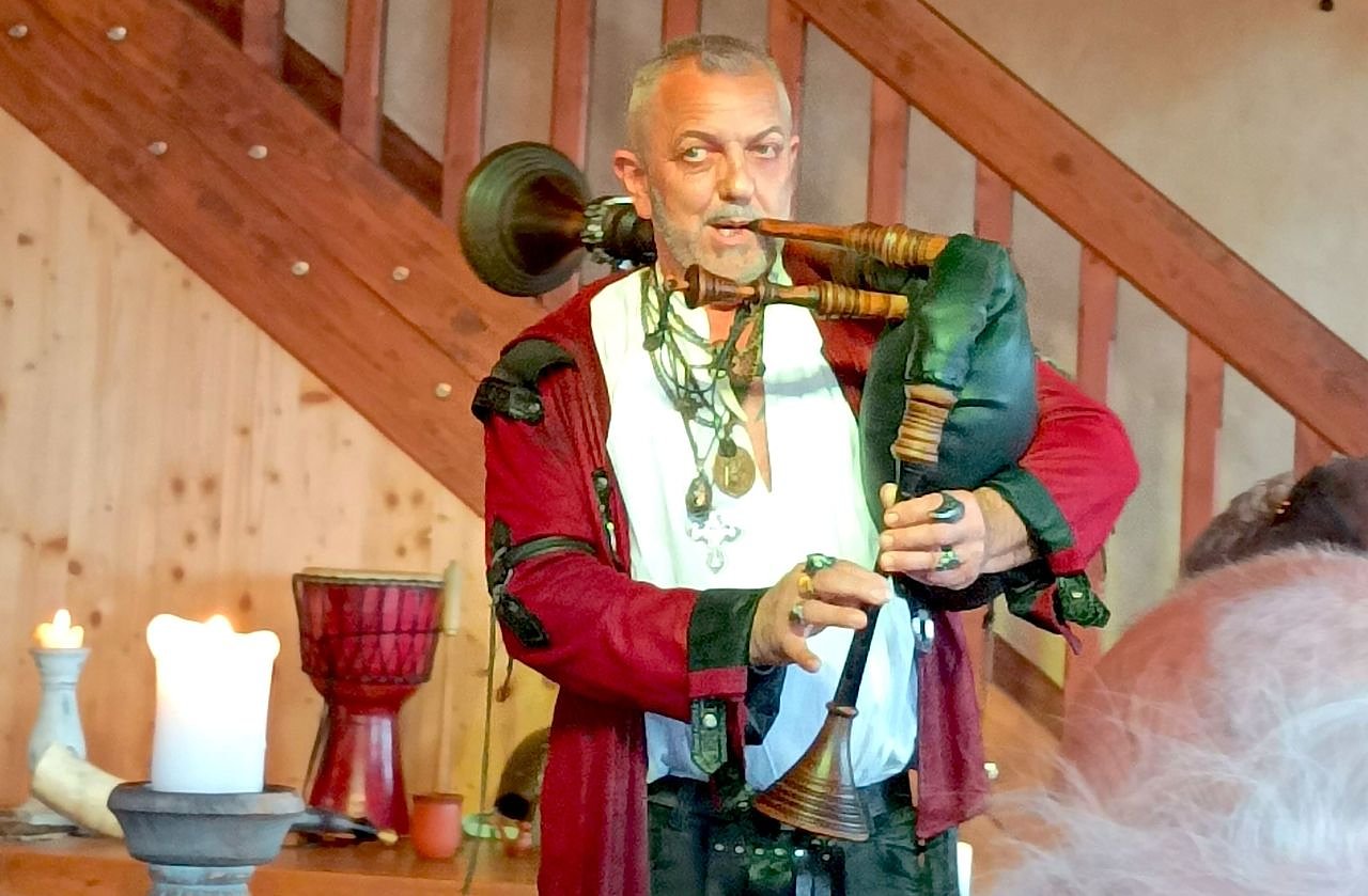 Begrüßt wurden wir mit Klängen aus einer Mittelalter-Pfeife, bekannter unter dem Begriff als Dudelsack, durch Herrn Kai Prengel. Das ist ein recht lautstarkes Instrument. Das war damals auch wichtig, gab es im Mittelalter auf den Märkten, Burgen usw. bekanntlich noch keinen Strom und keine Verstärker wie heutzutage.
