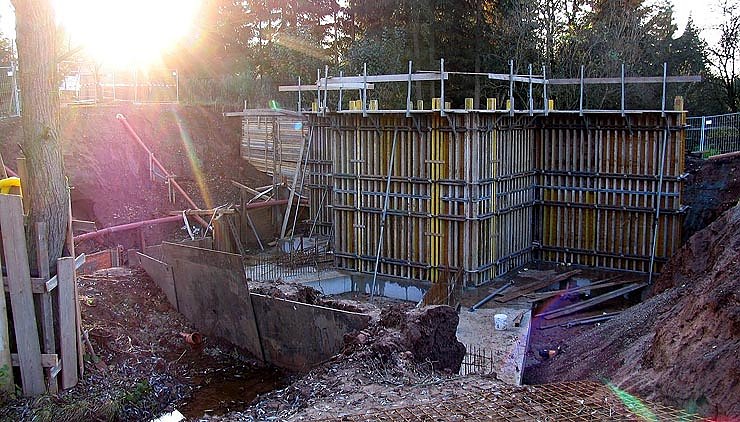 Der Bau des Beckens - es soll zum Jahresende fertig sein - sei technisch anspruchsvoll. Insbesondere die Gründung im Boden war eine Herausforderung. Wegen des massiv zuströmenden Schicht- und Grundwassers im Gumpetal und des inhomogenen Schichtenaufbaus des Baugrundes musste für die Baugrube ein Brunnen zur Grundwasserabsenkung installiert werden, und um die Baugrube musste eine Drainage verlegt werden, sagte Frau Windisch. Auch die Verlegung Gas- und Stromleitung, die das Bauwerk kreuzen, sei zeitaufwändig gewesen, da sich diese Versorgungsleitungen auf einer Länge von 100 Metern fast 5 tief in der Erde lägen. Doch die Arbeiten seien seit dem Beginn im Oktober gut voran gegangen: Stützwände, Decke und Flügelwände des Beckens sind fertig, 20 Tonnen Stahl und 300 Kubikmeter Beton verbaut, so Frau Windisch.