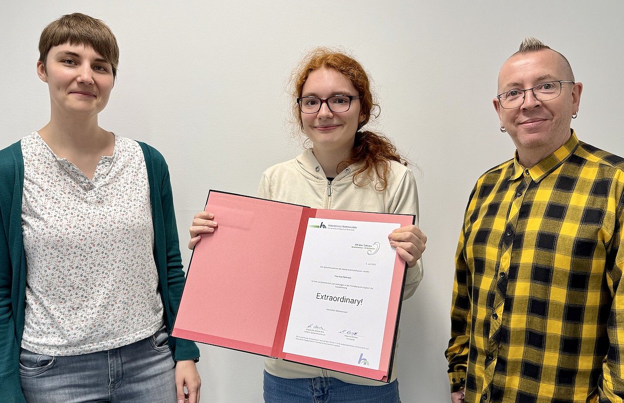 Das Sprachenzentrum der Hochschule Nordhausen freut sich, Frau Eva Pfeilmeier, Studierende im 4. Fachsemester im Studiengang Betriebswirtschaftslehre, für ihren außergewöhnlichen Einsatz und ihre beeindruckende Entwicklung im SoSe 2025 auszuzeichnen...