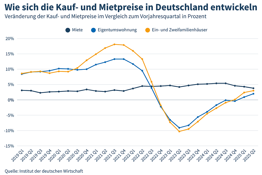 Der Immobilienmarkt tritt in eine neue Phase ein: Die Kaufpreise gingen nicht mehr flächendeckend zurück, stattdessen entwickelten sie sich regional unterschiedlich. Zentrale Lagen in Metropolen haben wieder an Wert gewonnen, während das Umland sich langsam erholt, sagt IW-Immobilienexperte Pekka Sagner. Gleichzeitig bleiben die Mietmärkte angespannt – getrieben von Angebotsengpässen, demografischem Wandel und zurückhaltender Bautätigkeit.