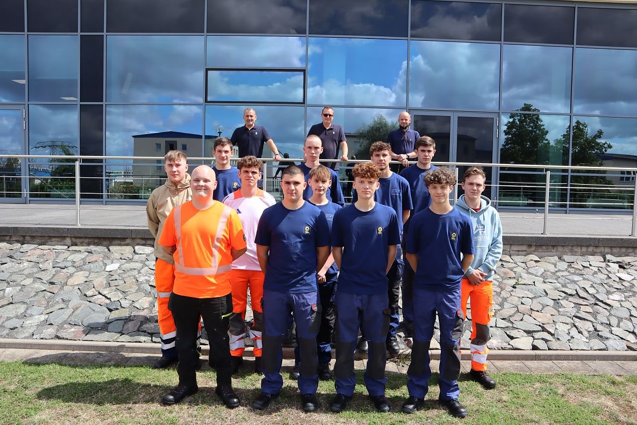 Autor: redDarunter angehende Konstruktionsmechaniker, Bergbautechnologen, eine Fachkraft für Lagerlogistik sowie eine Fachkraft für Metalltechnik. Zwei Azubis treten ihre Ausbildung im Schwester-Unternehmen GWE an.