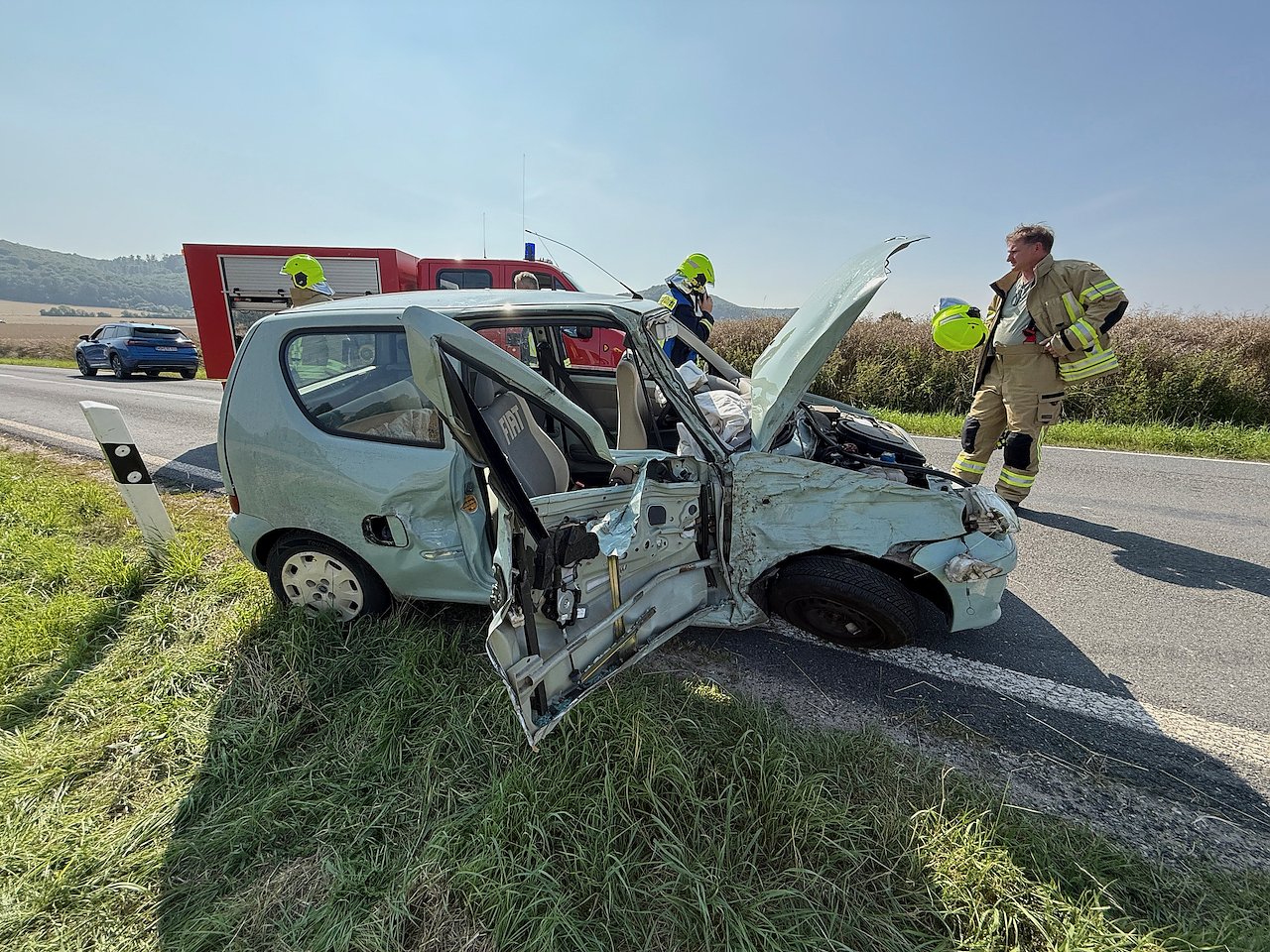 Ein aus dem Wohnort stammender Ersthelfer brachte den Hund zu Angehörigen der Unfallfahrerin. Am Auto entstand Totalschaden. Das Fahrzeug musste durch ein Abschleppunternehmen geborgen werden Die Straße war für die Zeit des Rettungseinsatz für ca. 60 Minuten voll gesperrt.
