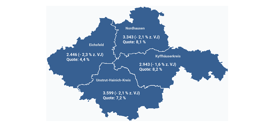 Die Arbeitslosigkeit ist im Landkreis Nordhausen im August 2025 gesunken. 3.343 Menschen waren arbeitslos gemeldet, 138 Arbeitslose weniger (- vier Prozent) als im Juli und 71 Personen bzw. 2,1 Prozent weniger als vor einem Jahr. Die Arbeitslosenquote betrug 8,1 Prozent. Vor einem Jahr lag sie bei 8,2 Prozent.
