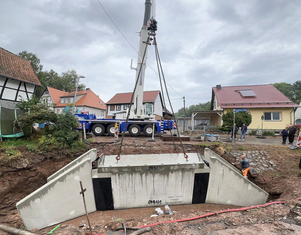 Beim neuen Durchlassbauwerk handelt es sich um einen geschlossenen Rahmen in Stahlbetonfertigteilbauweise. Die lichte Weite (rechtwinklig) beträgt 1,9 m und lichte Höhe 1,6 m. Das Bauwerk führt ein HQ100 mit einem Freibord von ca. 90 cm ab. Das Stahlbetonfertigteil wurde am Donnerstag eingehoben. Hierfür war eine Vollsperrung und ein Mobilkran erforderlich. Das Gewicht des Unterteils beträgt 40 t; und das Gewicht des Oberteils rund 8 t. Eine Herausforderung waren die beengten Verhältnisse im Bereich der bestehenden Bebauung. Erschwerend waren die Oberleitungen quer über die Baugrube sowie das enge Zeitfenster von 8:30 bis 12:00 Uhr, so Lina-Marie Bielefeldt, Sachgebiet Tiefbau im Bauamt der Stadt Nordhausen.