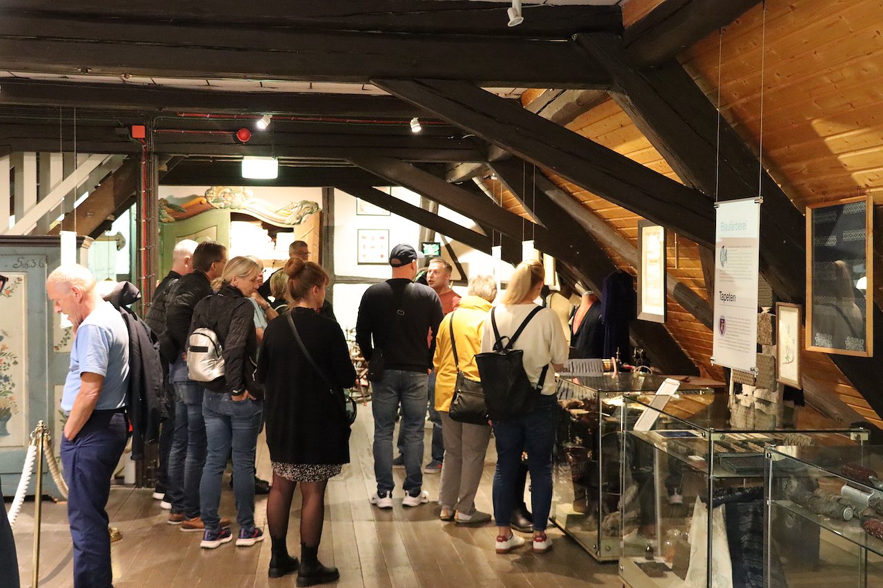 Die Besucherinnen und Besucher hatten die Möglichkeit, sich im Rathaus von 1609 und im benachbarten Stadthaus von 1909 in den Treppenhäusern und dem Ratskeller historische Ölgemälde anzuschauen, die auf historische Ereignisse der Stadt Bezug nehmen. Ein besonderer Dank gilt Heidelore Kneffel für diesen Rundgang.