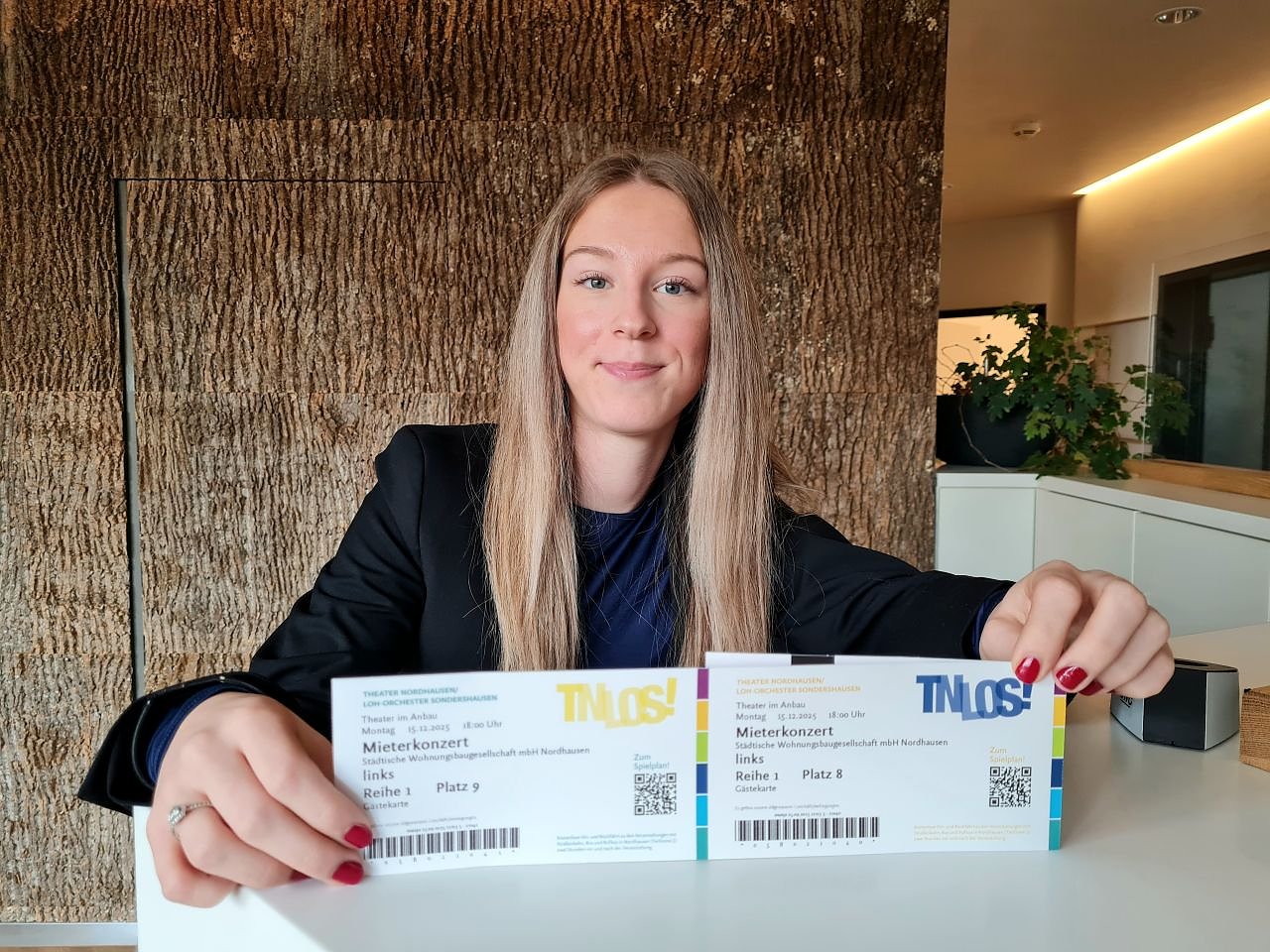 Auszubildende Luisa Hoyer präsentiert die Karten für die SWG-Mieterkonzerte. Diese können in der Geschäftsstelle, Geseniusstraße 3, abgeholt werden. (Foto: SWG Nordhausen/S.Schedwill)