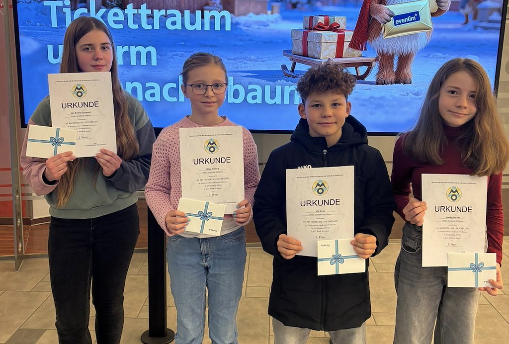 Autor: redSie haben sich damit auch für die Landesrunde qualifiziert, die am 27. und 28. Februar 2026 in Erfurt ausgetragen wird. [Hier Bild einfügen, von links nach rechts sind zu sehen: Ida Rosalie Hermann (8.4), Mirja Dietrich (5.1), Ole Krug (5.1), Emilia Kreckler (6.2)] In der Klassenstufe 5 erreichten Ole Krug und Mirja Dietrich jeweils einen dritten Platz.