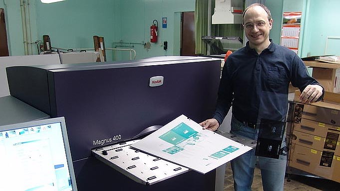 Eine Maschine mit Infrarot-Druckplattenbelichter. Die Druckplatte hatte eine weitaus größere Reise hinter sich. Über den großen Teich fand sie ihren Weg aus den USA in das Nordhäuser Unternehmen. Kodak Thermaldirect, so ihre Bezeichnung, und Magnus 400 ergeben zusammen einen völlig chemiefreien Herstellungsprozess von Offsetdruckplatten.