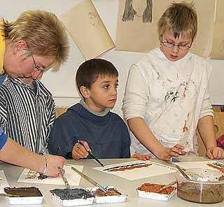 Der Hort der evangelischen Grundschule besuchte am ersten Ferientag die Jugendkunstschule. Passend zum Jahresthema Die Erde wurden mit Erde Kunstwerke geschaffen. Wie bei den Steinzeitmenschen musste die Farbe selbst hergestellt werden. Jedes Kind hatte ein mit Erde gefülltes Glas mit. Alle waren erstaunt über die unterschiedliche Färbung. Nun wurde gerieben und gerührt. Die eigenen Farben wurden mit Pinseln auf Papier gestrichen. Nun wagten sich alle an größere Formate und mehrere Blätter wurden an der Staffelei zu kleinen Kunstwerken. Beim Mittagessen tauschten Schüler ihre Erfahrungen aus und waren sichtlich stolz auf ihre Ergebnisse.
