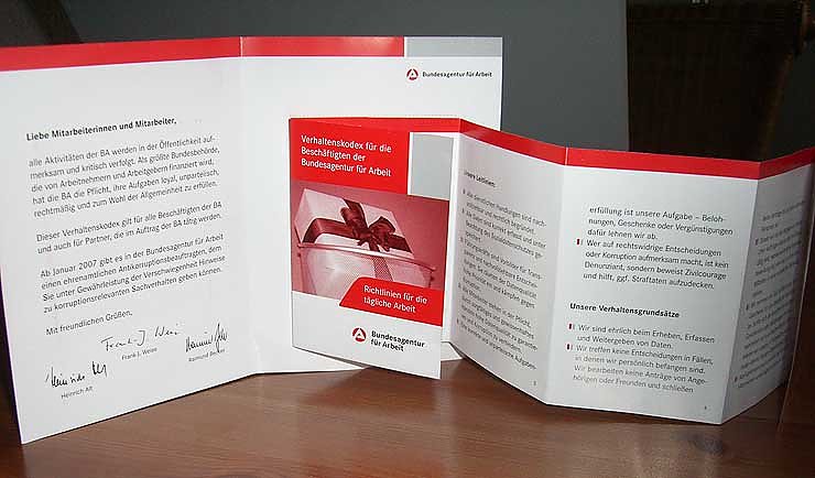 Die hier beschriebene Szene ist natürlich erfunden. Doch sie könnte bald vom Reich der Fantasie und die graue Welt der Realität wechseln. Allen Mitarbeitern der Bundesagentur für Arbeit (BA) ist – und das ist eine Tatsache, eine kleine Broschüre ausgegeben worden, Verhaltenskodex für die Beschäftigten der Bundesagentur für Arbeit nennt sich das Teil. Und wie das in einer zentralistisch ausgerichteten Behörde der Fall ist, gibt es als Geschenk einleitende Worte der Oberen, in denen man den Unteren schon mal mitteilt, das sie alle in der Öffentlichkeit aufmerksam und kritisch verfolgt werden.