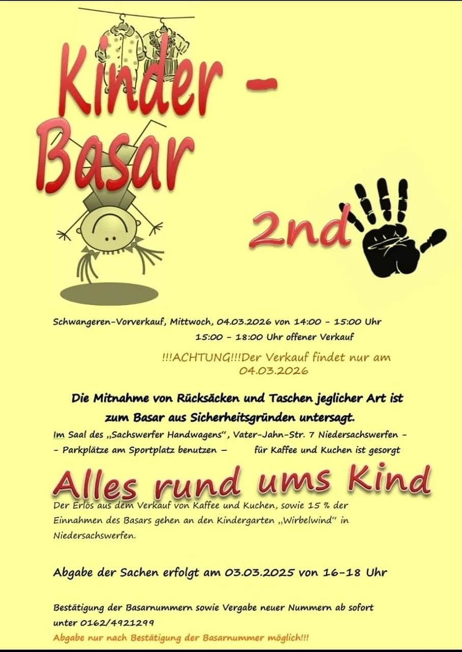 Der Kindergarten "Wirbelwind" organisiert am kommenden Mittwoch wieder einen Frühlings-Kindersachenbasar in Niedersachswerfen. Neu in diesem Jahr: Der Basar findet nur an einem Tag statt…Gut erhaltene Baby- und Kinderkleidung wird im "Sachswerfer Handwagen" in der Vater-Jahn-Straße 7 in Niedersachswerfen angeboten. Der Basar öffnet am Mittwoch, 4. März, von 15 bis 18 Uhr. Bereits ab 14 Uhr gibt es einen Vorverkauf für Schwangere.